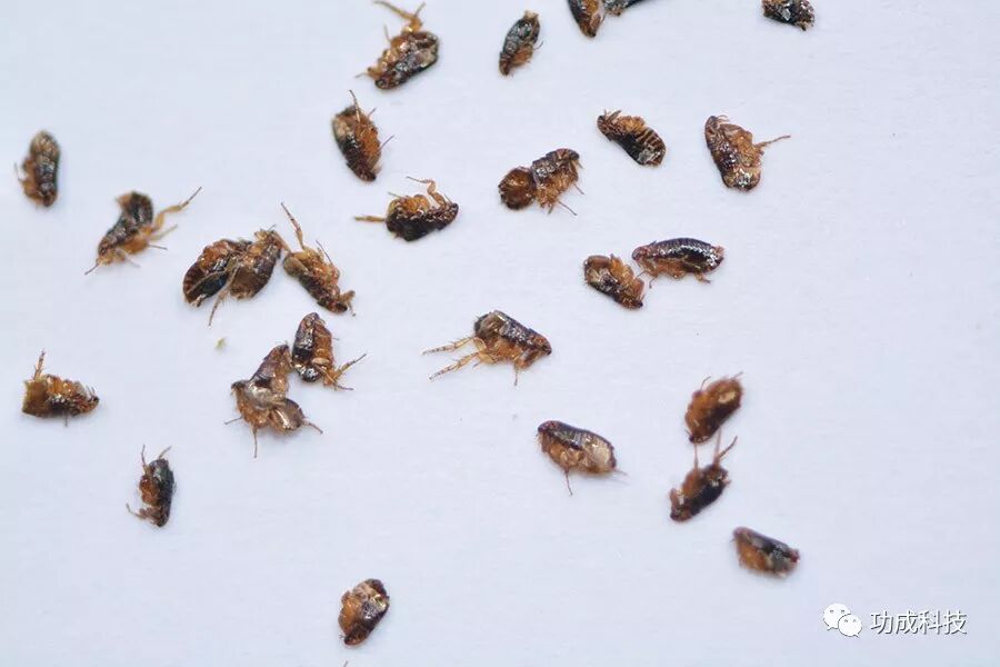 跳蚤咬后症状 属蚤科,客蚤属。是鼠疫的重要传播媒介,属世界性广布种,在我国除宁夏、新疆和西藏缺乏该蚤的记录外,几乎分布于全国各个省区。额圆缘,眼大色深,眼鬃位于眼的前方,后头鬃3列,下唇须达前足基节末端。 猫栉首蚤(Ctenocephalides felis) 亦称猫蚤,成虫体棕黄,额缘倾斜;眼发达,大而色深,眼鬃位于眼的前方。雄性抱器柄突呈杆状,末端膨大不明显。 现场案例 了解了跳蚤的相关知识后,我们又该怎样防治跳蚤呢?接下来我们以一个早教中心跳蚤现场为例,给大家介绍一下跳蚤的检查和防治方法。 针对于跳蚤的检查要点,可以分为两个部分——寄生蚤和游离蚤。顾名思义,寄生蚤为寄生在寄主身上的跳蚤,而游离蚤是指未寄生在寄主身上,而生活在环境中的跳蚤。 游离蚤的检查要点: 因跳蚤在除去寄主活动范围以外自身活动能力较弱,所以游离蚤一般都是小范围集中发生,在本现场中,跳蚤主要发现于早教中心的一间教室中。通过详细检查后发现,此间教室有大量跳蚤发生,在桌布、地毯、木板、门缝隙等处均发现有成虫活动迹象。 红色圈出的地方为发现跳蚤的区域 ⬆ 教室内地毯的明显缝隙 ⬆ 发生在早教中心的大量游离蚤 ⬆ 寄生蚤的检查要点: 寄生蚤的检查也是对于寄主的检查,准确确定寄主是检查寄生蚤的重点工作。以本次现场为例,考虑到该现场位于一个综合购物广场中,家养宠物活动较少,造成跳蚤危害很大程度上来自于流浪猫狗的携带,因此对于店铺外围及内部流浪猫狗的踪迹进行检查是首要的一项工作。 观察重点:店铺内的发现游离蚤的房间吊顶;店铺外的空调机外壳、墙角、缝隙等可能会有流浪猫狗的地区进行重点检查,检查源头寄主。善跳跃;跳蚤具有两条强壮的后腿,其可以跳过身长350倍的距离,相当于一个人跳过一个足球场。